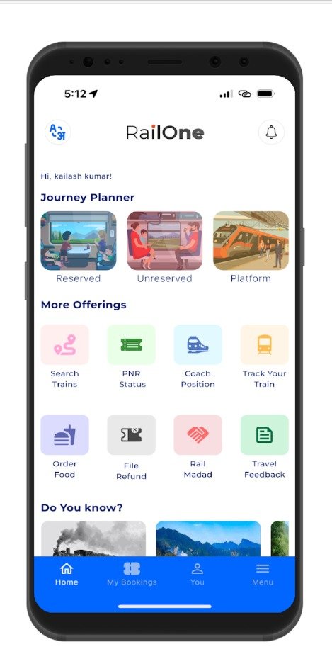ರೈಲ್ ಒನ್ ಮೊಬೈಲ್ ಅಪ್ಲಿಕೇಶನ್, ಪ್ರಯಾಣಿಕರಿಗೆ ಕಾಯ್ದಿರಿಸಿದ ಮತ್ತು ಕಾಯ್ದಿರಿಸದ ಟಿಕೆಟ್ಗಳ ಖರೀದಿ ಮಾತ್ರವಲ್ಲದೆ, ರೈಲುಗಳ ನೈಜಕಾಲದ ಸಂಚಾರದ ಸ್ಥಿತಿಗತಿ (Live Train Running Status) ಹಾಗೂ ಪಿ.ಎನ್.ಆರ್ ಸ್ಥಿತಿಗತಿ ತಿಳಿಯಲು, ದೂರುಗಳ ನೋಂದಣಿ, ರೈಲ್ ಮದದ್ ಮೂಲಕ ಸಹಾಯ, ಆಹಾರವನ್ನು ಆರ್ಡರ್ ಮಾಡುವುದು ಮುಂತಾದ ಸೇವೆಗಳನ್ನು ಒದಗಿಸುತ್ತದೆ.