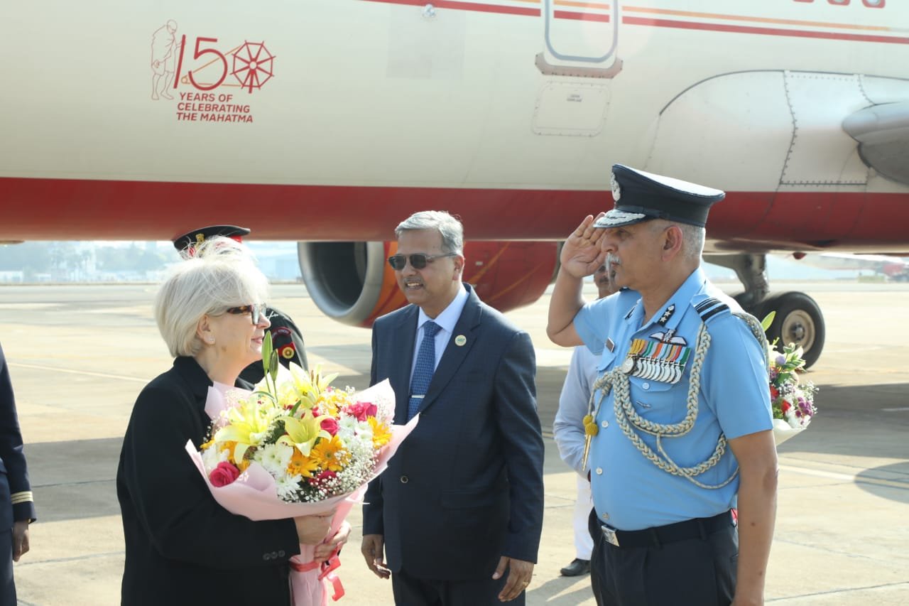 ವಿಶೇಷ ವಿಮಾನದಲ್ಲಿ ಬೆಂಗಳೂರಿನ ಹೆಚ್ ಎ ಎಲ್ ವಿಮಾನ ನಿಲ್ದಾಣಕ್ಕೆ ಆಗಮಿಸಿದ ಫ್ರೆಂಚ್ ರಕ್ಷಣಾ ಸಚಿವರಿಗೆ ವಿವಿಧ ಮಿಲಿಟರಿ ಪಡೆಗಳಿಂದ ಗೌರವ ವಂದನೆಯನ್ನು ಸಲ್ಲಿಸಲಾಯಿತು.