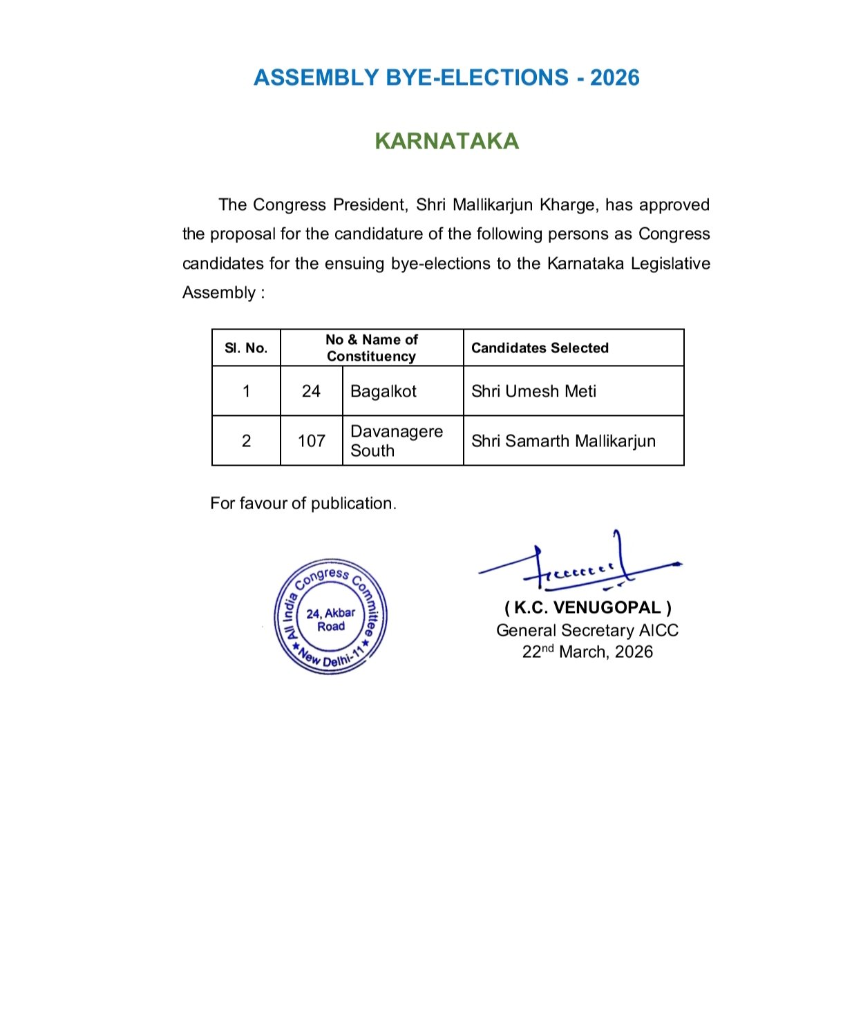 ಬೆಂಗಳೂರು: ಬಾಗಲಕೋಟೆ ಹಾಗೂ ದಾವಣಗೆರೆ ದಕ್ಷಿಣ ವಿಧಾನಸಭಾ ಕ್ಷೇತ್ರದ ಉಪಚುನಾವಣೆಗೆ ಇಂದು ಕಾಂಗ್ರೆಸ್ ತನ್ನ ಅಭ್ಯರ್ಥಿಗಳ ಪಟ್ಟಿ ಬಿಡುಗಡೆ ಮಾಡಿದ್ದು, ಬಾಗಲಕೋಟೆಯಿಂದ ಮಾಜಿ ಸಚಿವ ದಿವಂಗತ ಎಚ್. ವೈ. ಮೇಟಿ ಅವರ ಪುತ್ರ ಉಮೇಶ್ ಮೇಟಿಗೆ ಟಿಕೆಟ್ ನೀಡಿದೆ.