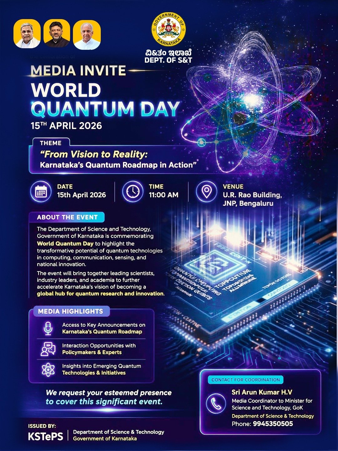 ಬೆಂಗಳೂರು:’ವಿಶ್ವ ಕ್ವಾಂಟಮ್ ದಿನಾಚರಣೆ’ಯ (𝗪𝗼𝗿𝗹𝗱 𝗤𝘂𝗮𝗻𝘁𝘂𝗺 𝗗𝗮𝘆) ಪ್ರಯುಕ್ತ, ವಿಜ್ಞಾನ ಮತ್ತು ತಂತ್ರಜ್ಞಾನ ಇಲಾಖೆಯ ವತಿಯಿಂದ ರಾಜ್ಯದ ತಂತ್ರಜ್ಞಾನ ವಲಯದ ಪ್ರಮುಖ ಮೈಲಿಗಲ್ಲಾದ ‘ಕರ್ನಾಟಕ ರಾಜ್ಯ ಕ್ವಾಂಟಮ್ ಎಕೋ ಸಿಸ್ಟಮ್ ಮ್ಯಾಪ್’ ಅನಾವರಣ ಕಾರ್ಯಕ್ರಮವನ್ನು ಹಮ್ಮಿಕೊಳ್ಳಲಾಗಿದೆ.
