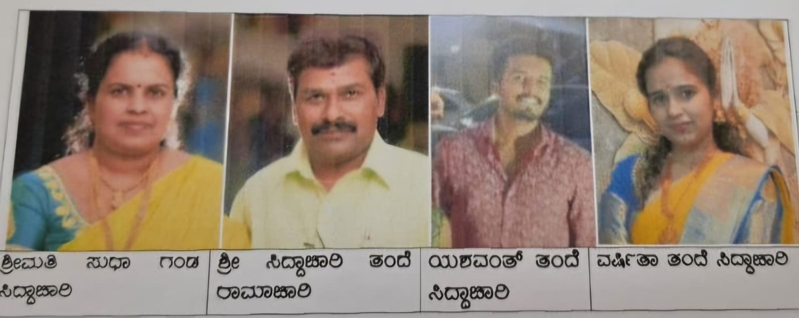 ಆರೋಪಿಗಳಾದ ಶ್ರೀಮತಿ ಸುಧಾ: ಗಂಡ ಸಿದ್ದಾಚಾರಿ (48 ವರ್ಷ), ಸಿದ್ದಾಚಾರಿ: ತಂದೆ ರಾಮಚಾರಿ (56 ವರ್ಷ), ಯಶವಂತ್: ತಂದೆ ಸಿದ್ದಚಾರಿ (28 ವರ್ಷ) ಮತ್ತು ಕುಮಾರಿ ವರ್ಷಿತಾ: ತಂದೆ ಸಿದ್ದರಾಜು (26 ವರ್ಷ) ಈ ನಾಲ್ವರು ಆರೋಪಿಗಳು ಸದ್ಯ ತಲೆಮರೆಸಿಕೊಂಡಿದ್ದು, ಇವರ ಬಗ್ಗೆ ಯಾವುದೇ ಮಾಹಿತಿ ಲಭ್ಯವಿದ್ದಲ್ಲಿ ಕೂಡಲೇ ದೂರವಾಣಿ ಸಂಖ್ಯೆ: 9480800155 ಮತ್ತು 080-22094445ಗಳಿಗೆ ಕರೆ ಮಾಡಿ ಮಾಹಿತಿ ನೀಡುವಂತೆ ಪೊಲೀಸರು ಸಾರ್ವಜನಿಕರಲ್ಲಿ ಮನವಿ ಮಾಡಿದ್ದಾರೆ. ಮಾಹಿತಿ ನೀಡುವವರ ವಿವರಗಳನ್ನು ಗೌಪ್ಯವಾಗಿಡಲಾಗುವುದು ಎಂದು ಜಯನಗರ ಠಾಣೆಯ ಇನ್ಸ್ಪೆಕ್ಟರ್ ಪ್ರಕಟಣೆಯಲ್ಲಿ ತಿಳಿಸಿದ್ದಾರೆ.