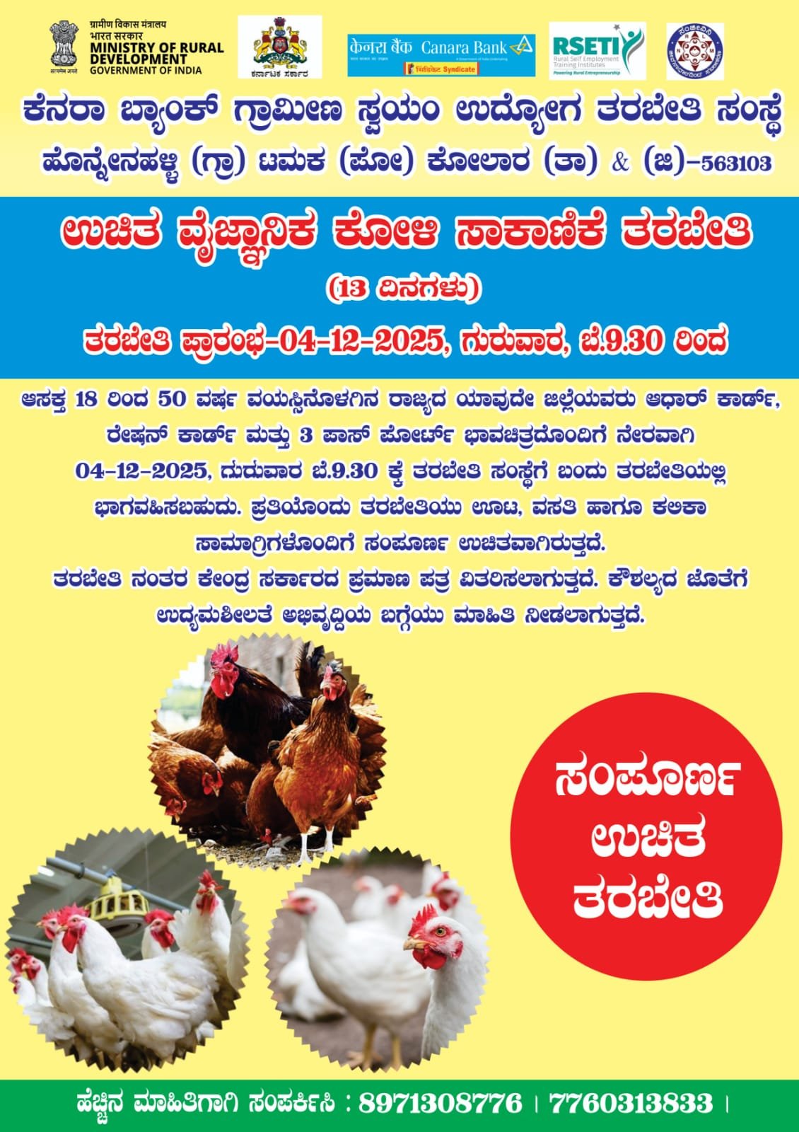 ಕೋಲಾರ: ನಗರ ಹೊರವಲಯದ ಹೊನ್ನೇನಹಳ್ಳಿಯ ಕೆನರಾ ಬ್ಯಾಂಕ್ ಗ್ರಾಮೀಣ ಸ್ವಯಂ ಉದ್ಯೋಗ ತರಬೇತಿ ಸಂಸ್ಥೆಯಲ್ಲಿ ನಿರುದ್ಯೋಗಿ ಯುವಕ, ಯುವತಿಯರಿಗಾಗಿ ಉಚಿತ ವೈಜ್ಞಾನಿಕ ಕೋಳಿ ಸಾಕಾಣಿಕೆ ತರಬೇತಿಯನ್ನು ಹಮ್ಮಿಕೊಳ್ಳಲಾಗಿದೆ.